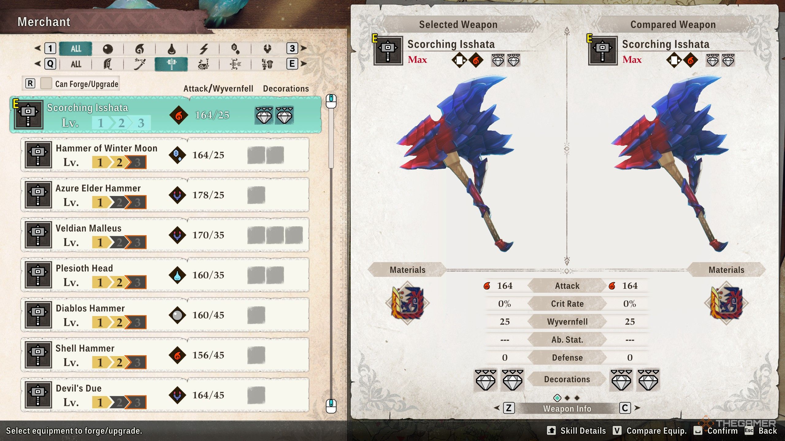 Раскалённая Иссата наносит 165 урона огнём и имеет 25 Wyvernfell. Хотя её Wyvernfell немного ниже, чем у других молотов, она компенсирует это двумя слотами для украшений.