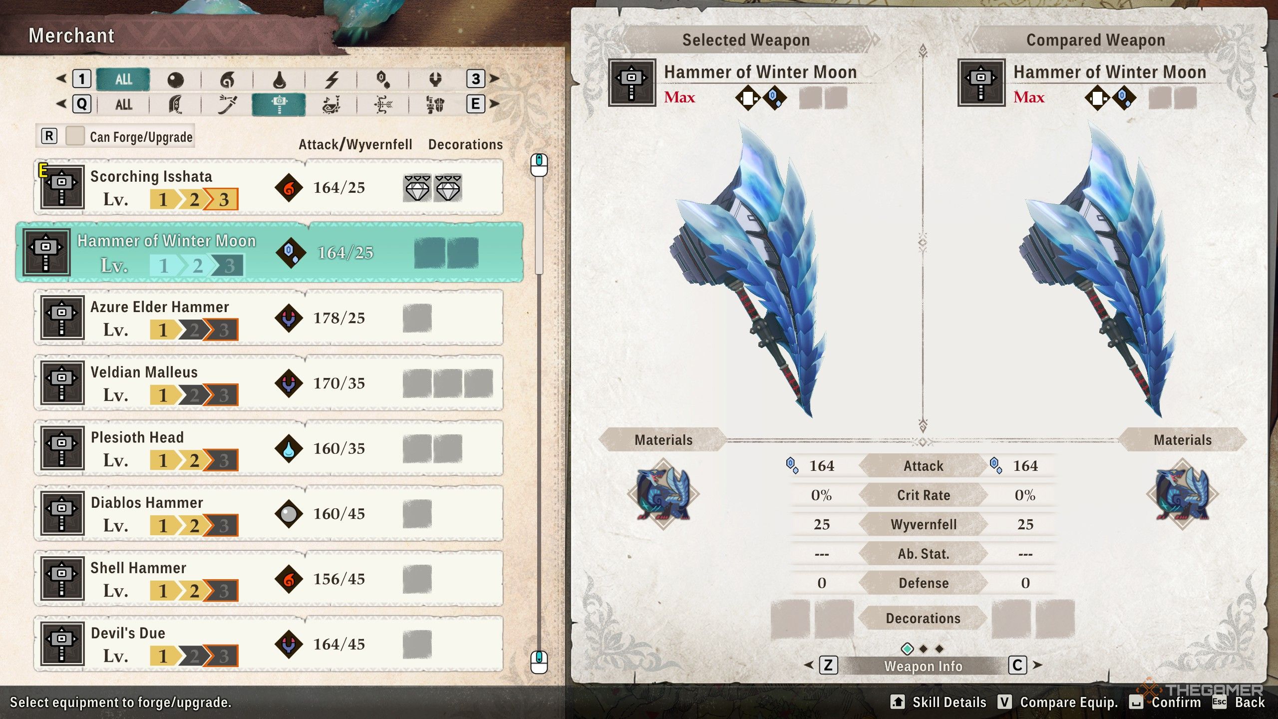 Молот Зимной Луны — универсальное оружие, похожее на Испепеляющую Иссата, но наносящее Урон Холодом. Оно наносит 164 Урона Холодом, имеет место для двух Украшений и требует 25 Wyvernfell для изготовления.