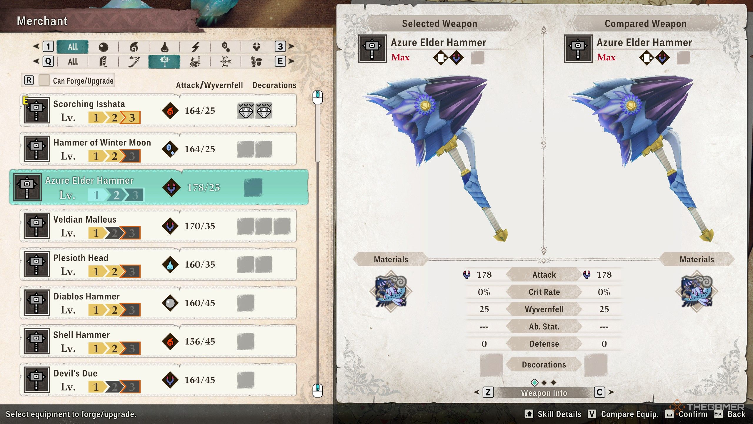 Молот Древнего Лазурного цвета, изготовленный Ибуши, является самым мощным молотом в игре, наносящим 178 урона стихией Дракон. Он также имеет 25 Wyvernfell и один слот для декорации, позволяющий ещё больше увеличить его силу.