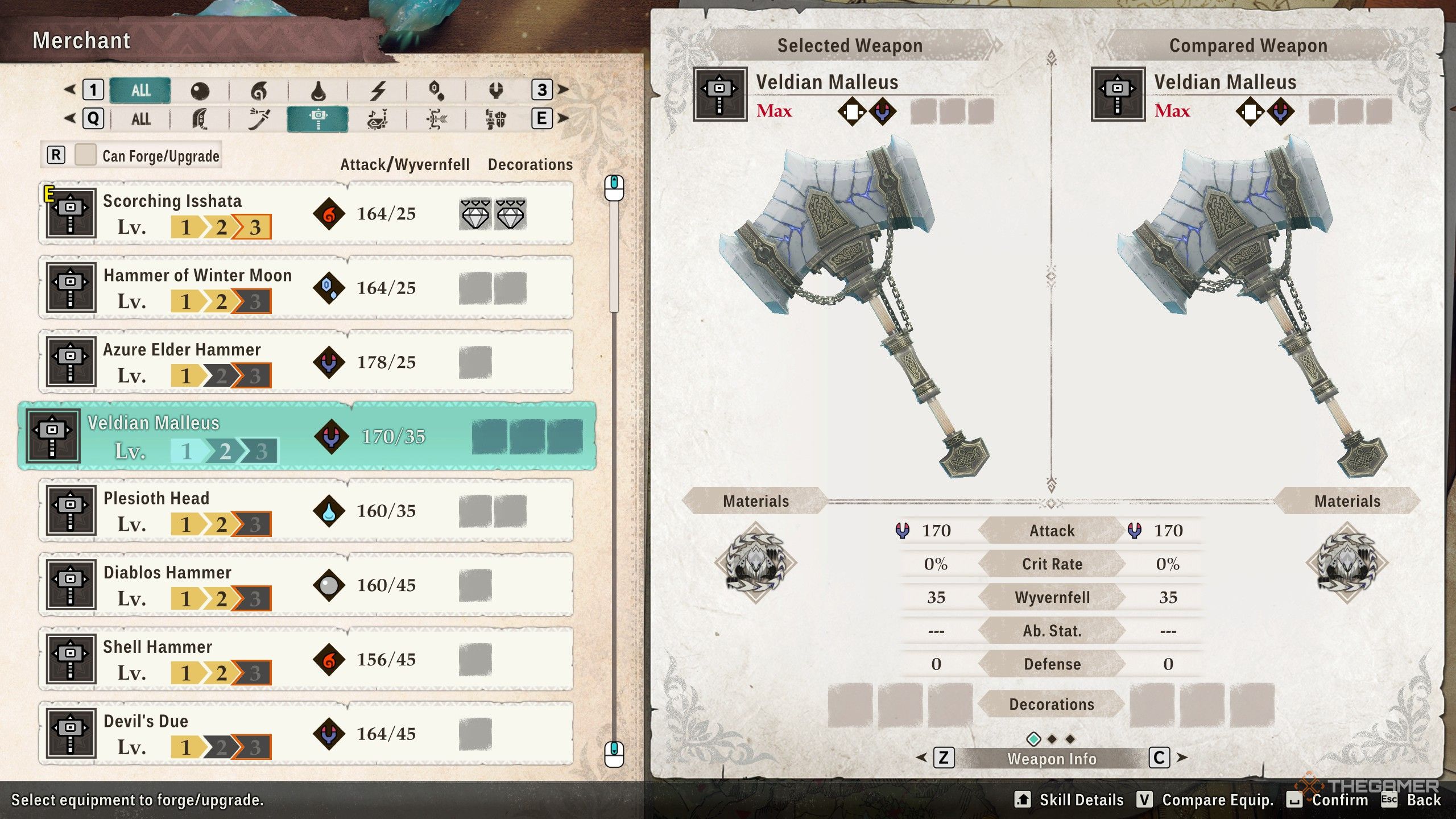 Молот Veldian Malleus – очень мощное оружие, наносящее 170 урона от Dragon и имеющее 35 Wyvernfell. Он также имеет три слота для декораций, позволяющих настроить его под вашу сборку.