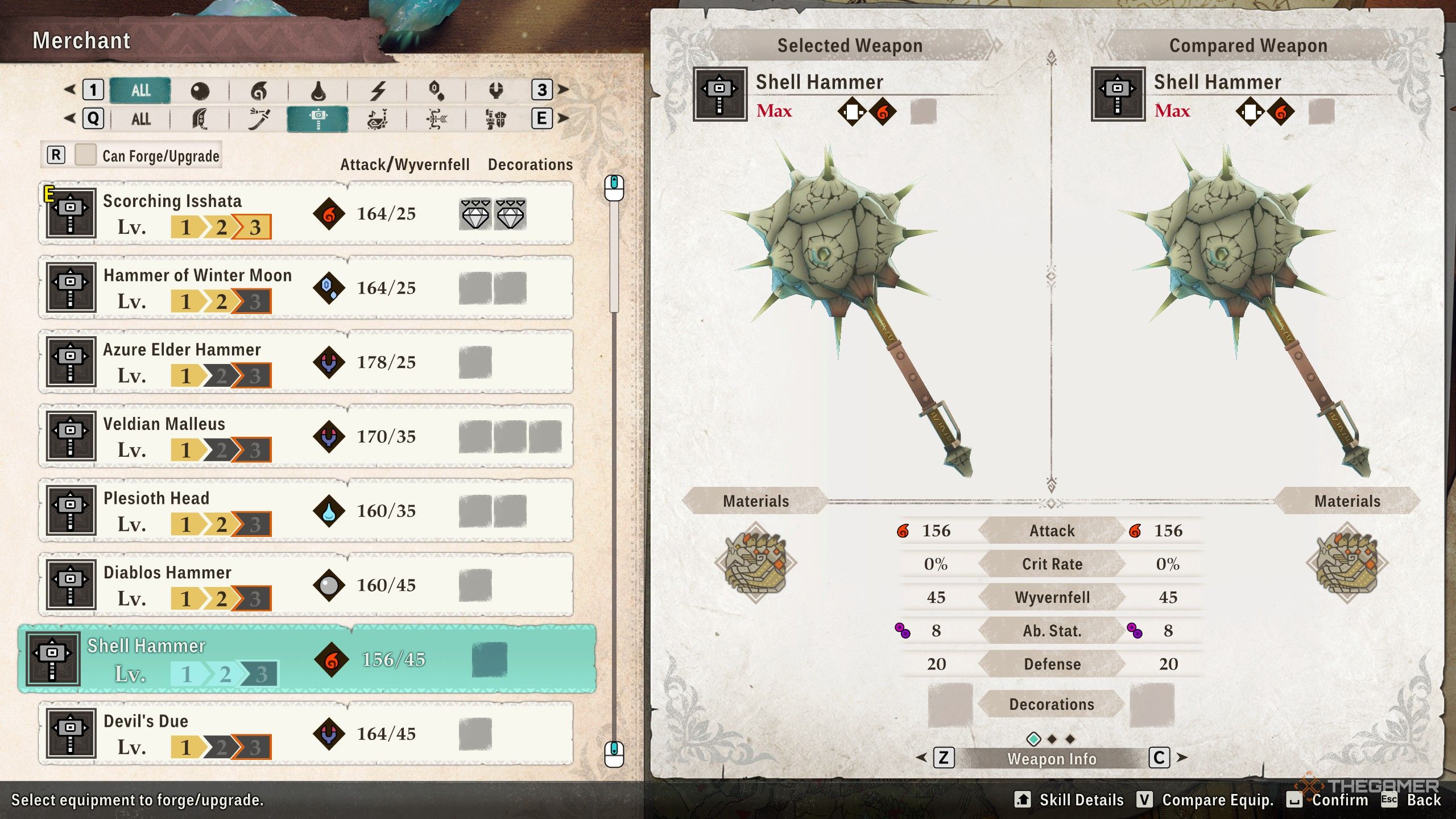 Молот Ракушки – мощное оружие, наносящее 156 урона Огнём и 45 урона от Wyvernfell. Он также повышает вашу Защиту на 20 и отравляет врагов. Несмотря на наличие только одного слота для Украшений, это всё ещё отличный универсальный выбор.
