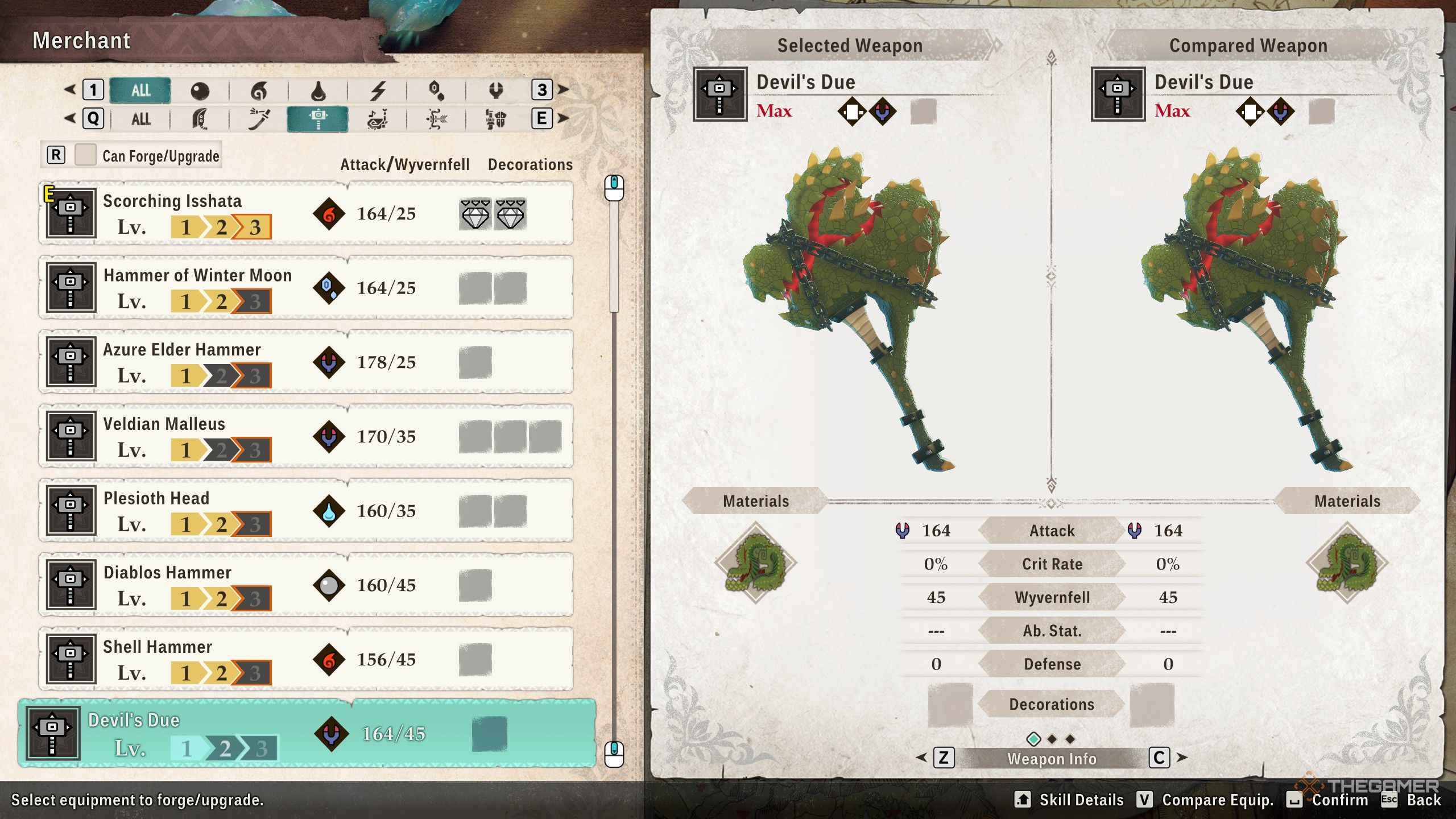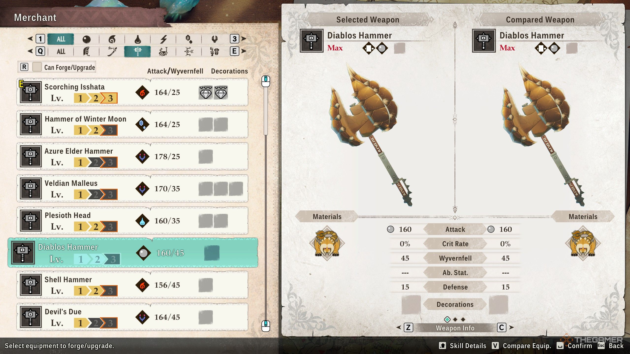 Окей, так молот Дьябло действительно хорош! Он наносит 160 урона обычно, массивные 45 против монстров Вайверфелла, и даёт вам дополнительно 15 Защиты. Единственный недостаток? У него только один слот для украшения, но честно говоря, он и так наносит огромный урон, так что это не такая уж и большая проблема.