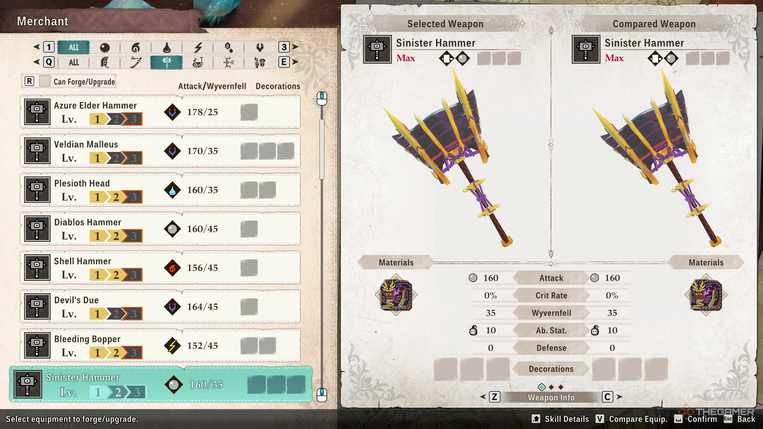 Зловещий Молот наносит 160 обычного урона, плюс 35 урона от Wyvernfell, и имеет три слота для декораций. Он также накапливает Blastblight, давая вам дополнительный потенциал урона в каждой битве.
