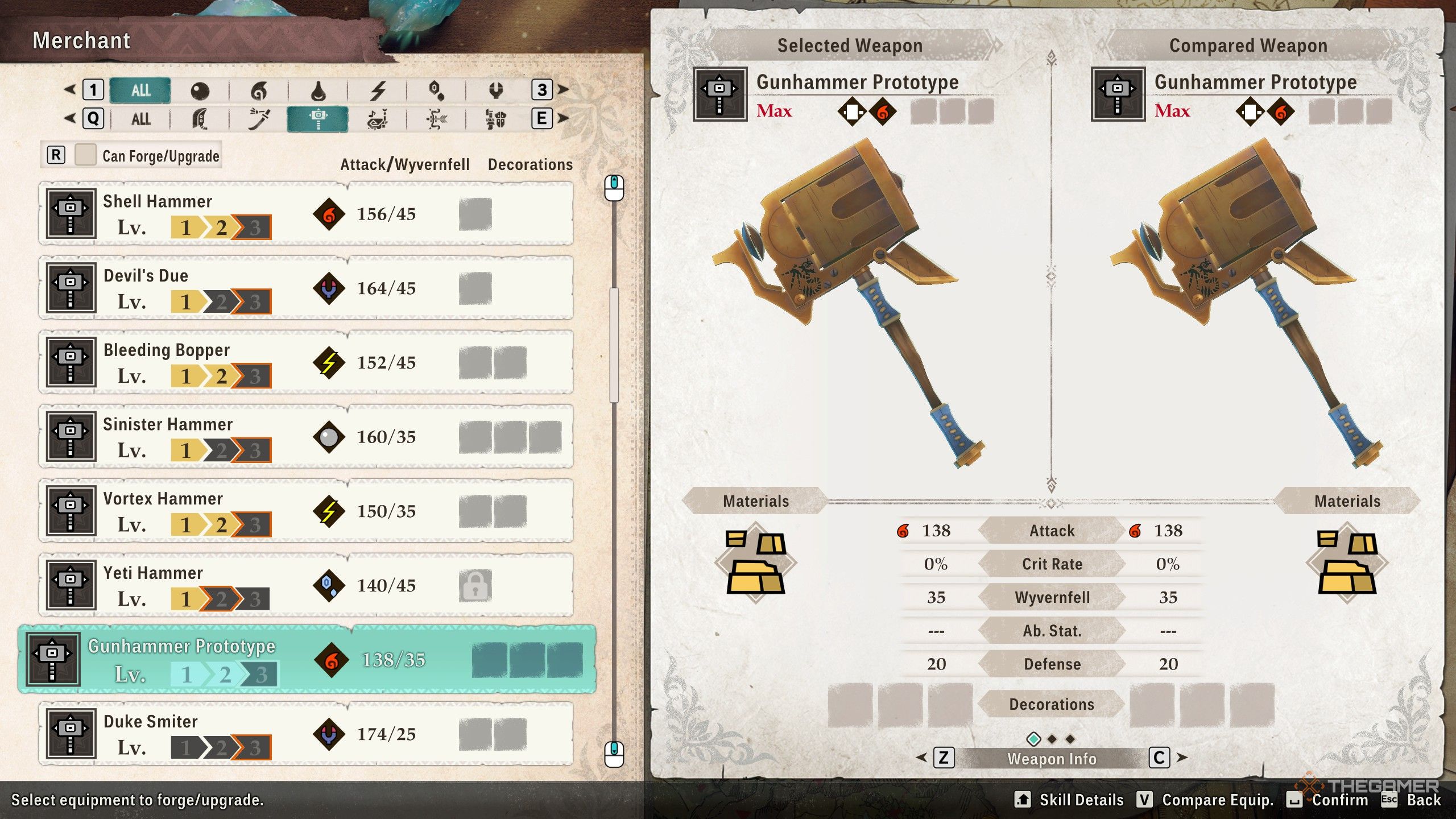 Вы можете найти прототип Пушечного Молота относительно рано в игре. Хотя урон от огня ограничен 138 единицами, он все еще обеспечивает полезный прирост с 20 дополнительной защитой и 35 урона против существ из Вайверфелла. Кроме того, три слота для украшений — это большое преимущество, когда вы только начинаете.